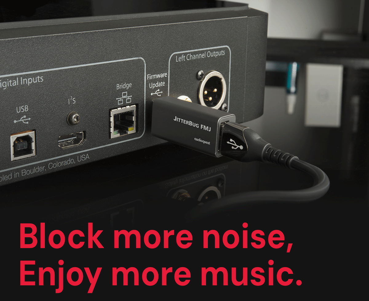 Noise reduction and noise dissipation is AudioQuest! One can’t hear our modern world’s pervasive RF Noise itself, but the compromises it causes robs us of detail and contrast, and outright buries so much subtlety. Fight back with JitterBug FMJ.