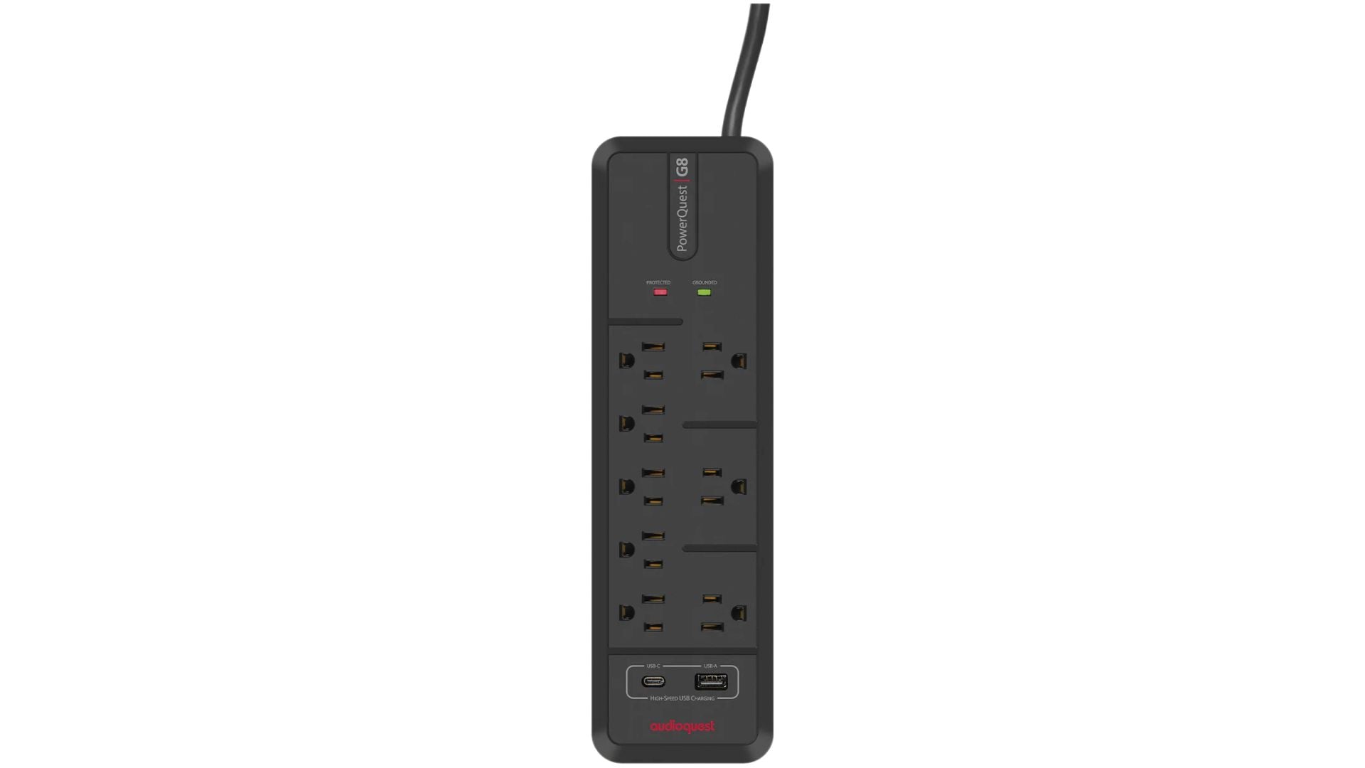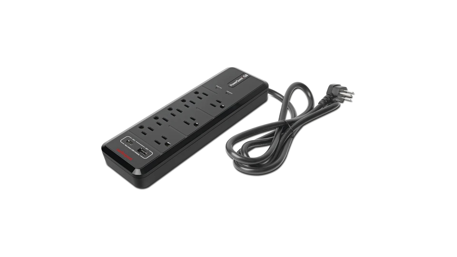 The PowerQuest G8 8-Outlet Surge Protector features Micro-Spike Technology, Catastrophic Surge Protection, and a slim (3.31” x 11.93” x 1.29”), durable enclosure with eight AC outlets and two high-speed USB ports.